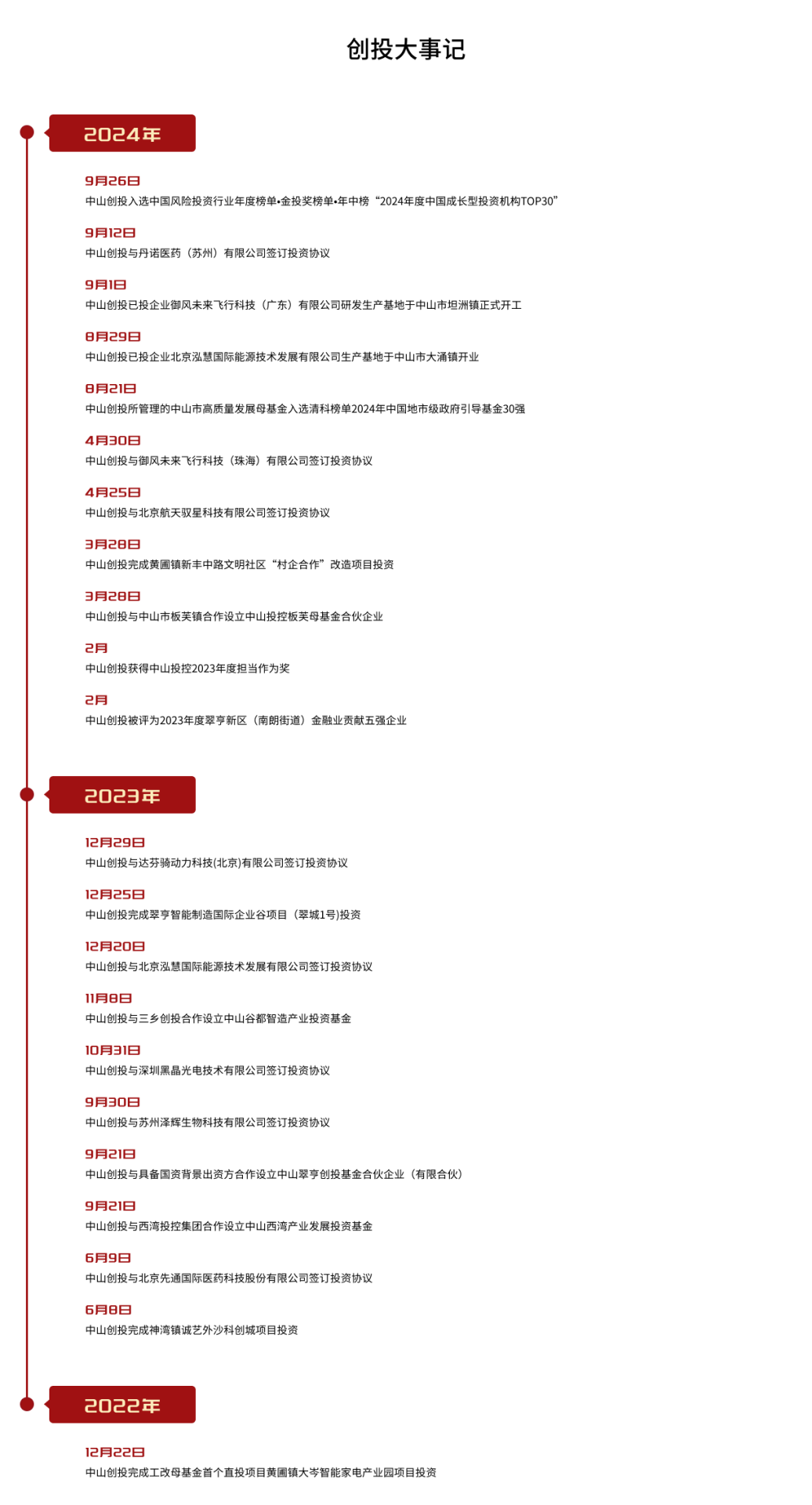 中山創業投資有限公司(簡稱“中山創投”)是中山投資控股集團有限公司(簡稱“中山投控”)落實中山市委、市政府“培育發展股權投資旗艦企業”要求,在中山金控資產管理有限公司及中山投控原有基金管理、股權投資業務基礎上整合組建,是中國證券投資基金業協會登記備案的私募基金管理人機構(中基協登記編號: P1065108)。中山創投組建完成后,承載著中山投控投資主業做強做優做大的使命,將圍繞新能源、新一代信息技術、智能裝備與先進制造、生物醫藥等中山市鼓勵發展的戰略性新興產業,推進大基金組建、大項目投資、大平臺建設,開展政府引導基金受托管理、股權直投等業務,為中山市經濟高質量發展貢獻國資創投力量。